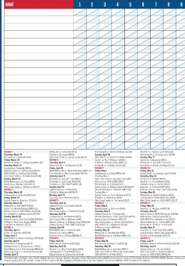 For the best mobile experience download the official afl fantasy app! Submitted 2 years ago by melbournemaarns. Macd crossover buy sell arrow. After debuting in 2010, league live has continued to innovate while nonetheless putting the followers. Hey guys, aussie living abroad here. Looking for 2019 afl tipping chart download pdf afl poster nt news? Afl tipping spreadhsheet with formulas to automatically calculate each person's tally. Footy tips, afl tipping, nrl tipping. Score cards for each round of fixtures included! Dont panic , printable and downloadable free 2019 afl tipping chart download pdf afl poster nt news we have created for you. At bettingtop10 australia, it's our aim to help you out with our free footy tips and betting predictions. Accurate paid afl for free. 1998 triple m tab 1998 afl football fixture tipping chart, nrl footy tipping 2018, continued success with the nrl tipping australia sports, 2020 afl tipping pack, double tipping pack 2019 proscore.
